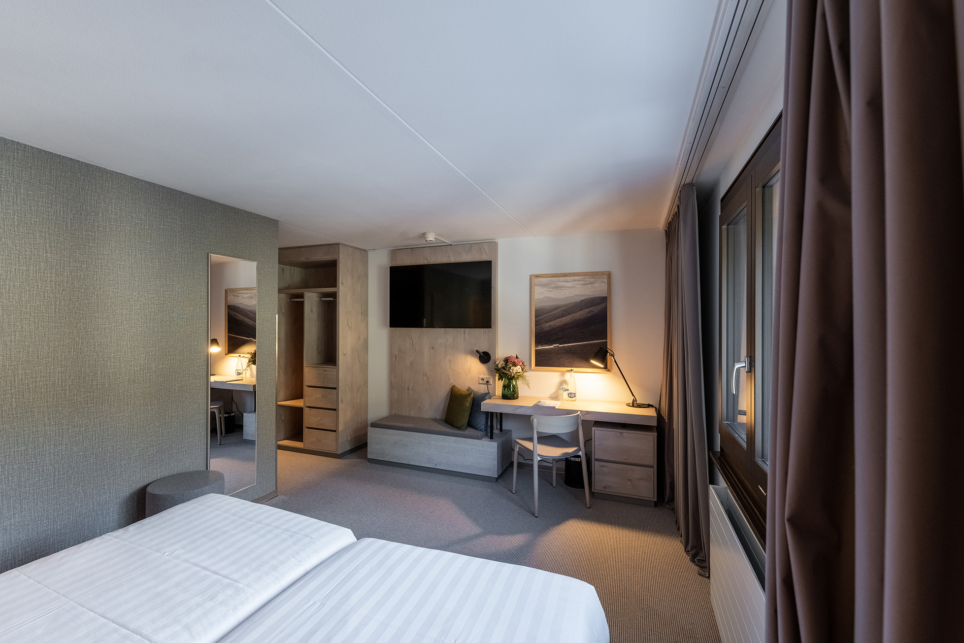 Step into the serene and peaceful world of the Comfort Forest room and let the calm of the alpine forest envelop you. Imagine waking up to the sound of birds singing, feeling the gentle sunlight shine through the trees, and spending your day discovering the secrets of Switzerland’s nature before returning to your cozy and comfortable retreat. The minimalist design, soft tones, clean lines, and natural materials further elevate the space, creating an elegant and calming environment, perfect to unwind and rejuvenate after an active day spent exploring.